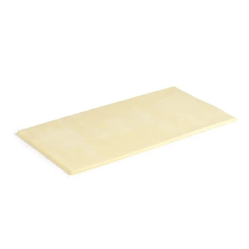 Massa crua e congelada, em placa de 28 x 43cm, com 2,5 mm de espessura, para desenvolvimento de receitas.